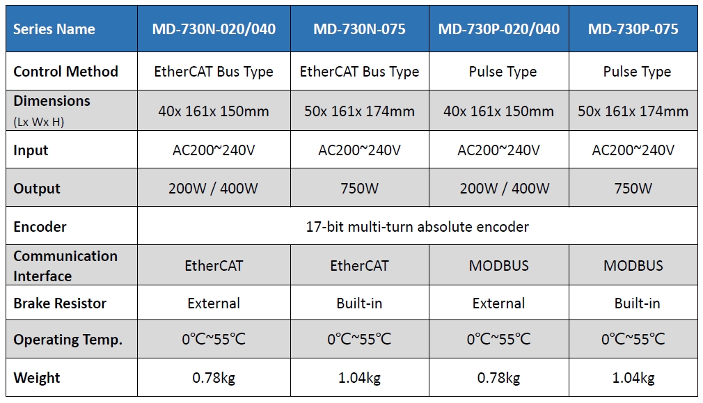 With the rapid development of industrial automation, intelligent manufacturing, and robotics technology, the demand for high-precision, high-dynamic-response, and high-reliability motion control is increasing day by day. MEAN WELL, the global leader in standard power supplies with over 40 years of experience in the standard power supply field, launches the MD-730 series servo drives based on high cost performance and high product efficiency. The series includes bus-type and pulse-type control methods, with a total of 6 products covering 200W, 400W, and 750W. It provides excellent performance for standard applications in 3C, photovoltaic, battery, packaging, and many other industries, offering enterprises efficient productivity.