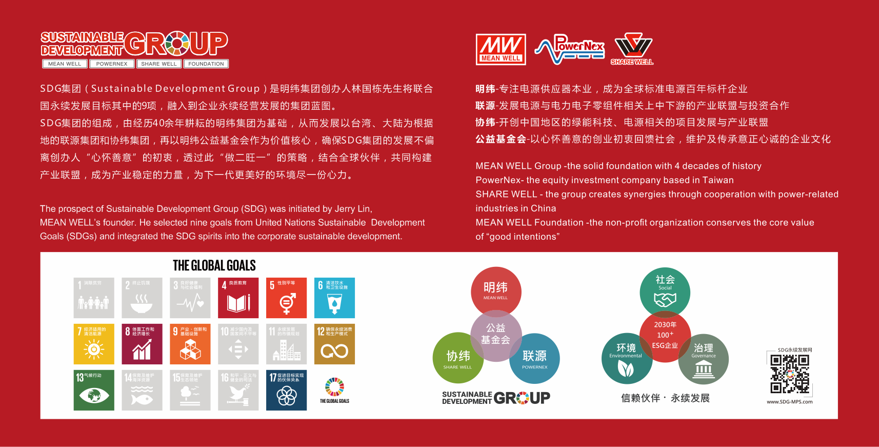届时,SDG集团创办人林先生,又向参访人员详细介绍了SDG集团的组成及ESG企业。SDG集团是由明纬集团创办人林国栋先生,结合联合国永续发展目标中的9项,以明纬、联源、协纬、公益基金会共同构建的产业联盟。